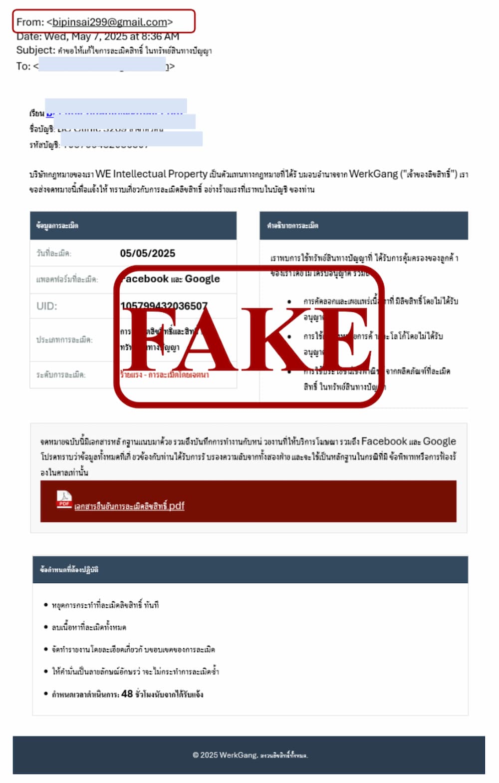 หากท่านได้รับอีเมลที่น่าสงสัยซึ่งแอบอ้างว่าเป็นบริษัท วี อินเทลเลคชวล พร็อพเพอร์ตี้ จำกัด (WE Intellectual Property Co., Ltd.) โปรด: